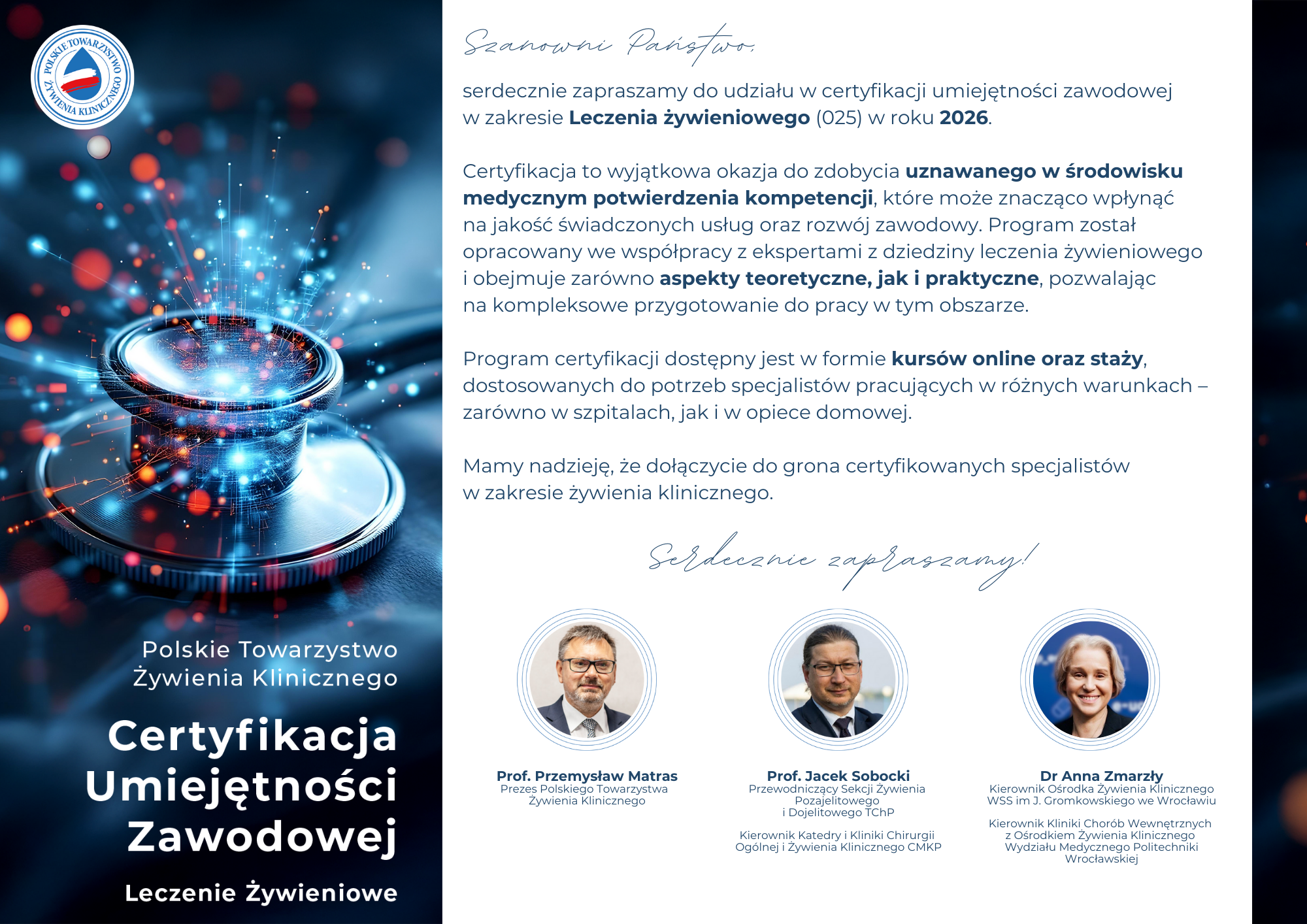 Polskie Towarzystwo Żywienia Klinicznego (PTŻK) zostało upoważnione do certyfikowania w zakresie umiejętności Leczenie żywieniowe, co stanowi istotny krok w podnoszeniu standardów opieki zdrowotnej w Polsce.