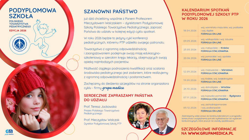 Zapraszamy do udziału w tegorocznym cyklu spotkań Podyplomowej Szkole Polskiego Towarzystwa Pediatrycznego. Tak jak i w latach ubiegłych, udział w szkoleniach jest BEZPŁATNY.